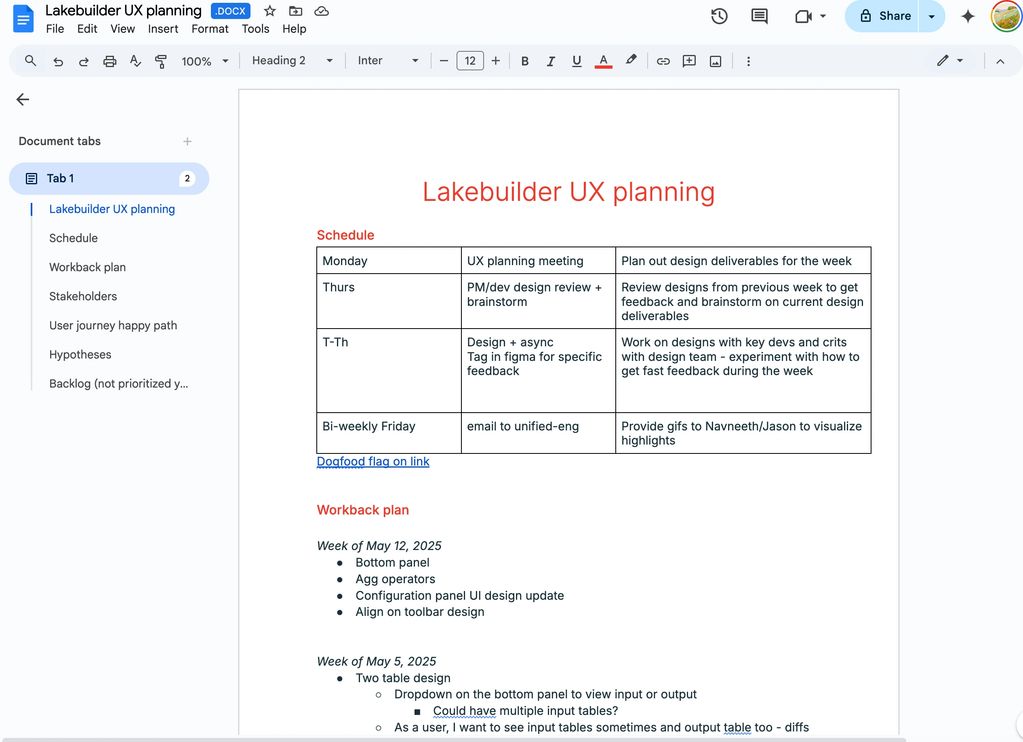 For these projects, I created weekly meetings with the other 3 designers working on other parts of Lakeflow (such as declarative DLT pipelines, notebooks and scheduling jobs). I set up the meetings to have one person assigned for the first 30 minutes and then an open slot for the final 30 minutes based on who needed UX-centric feedback that week.