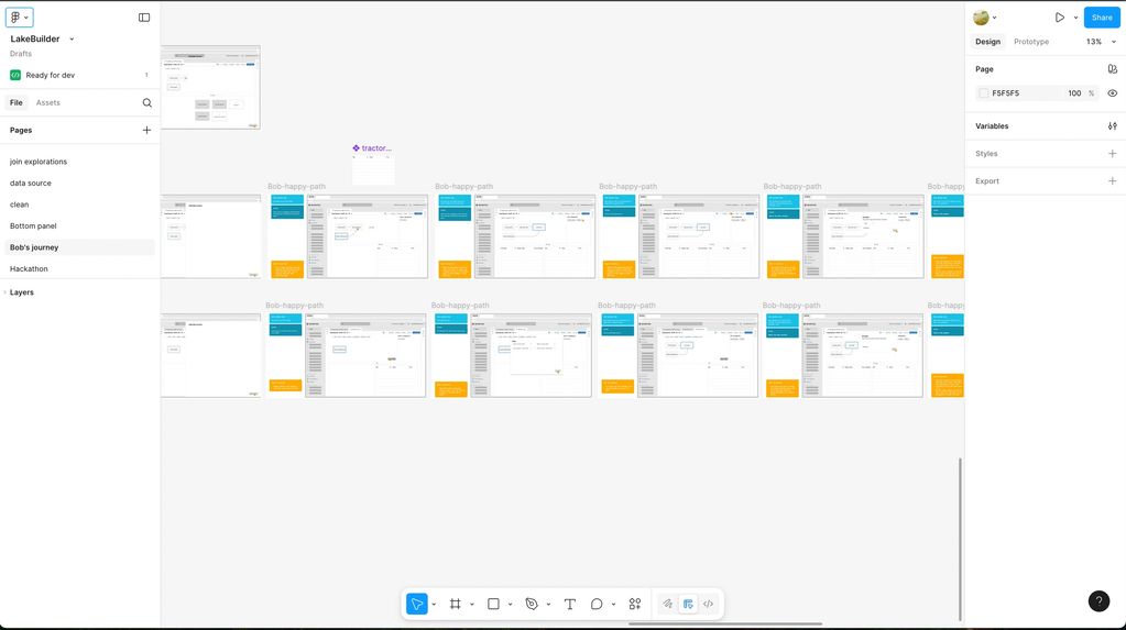 Early in Figma, I create keyframes—like a movie storyboard—using real customer stories, such as a tractor analyst using IoT data. This quickly aligns the team on workflow direction and highlights design tradeoffs.