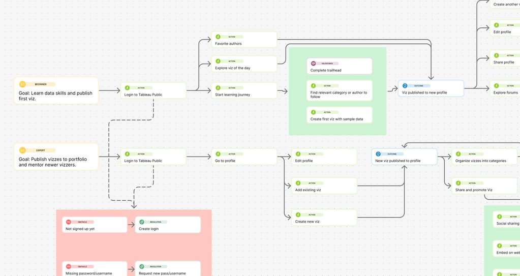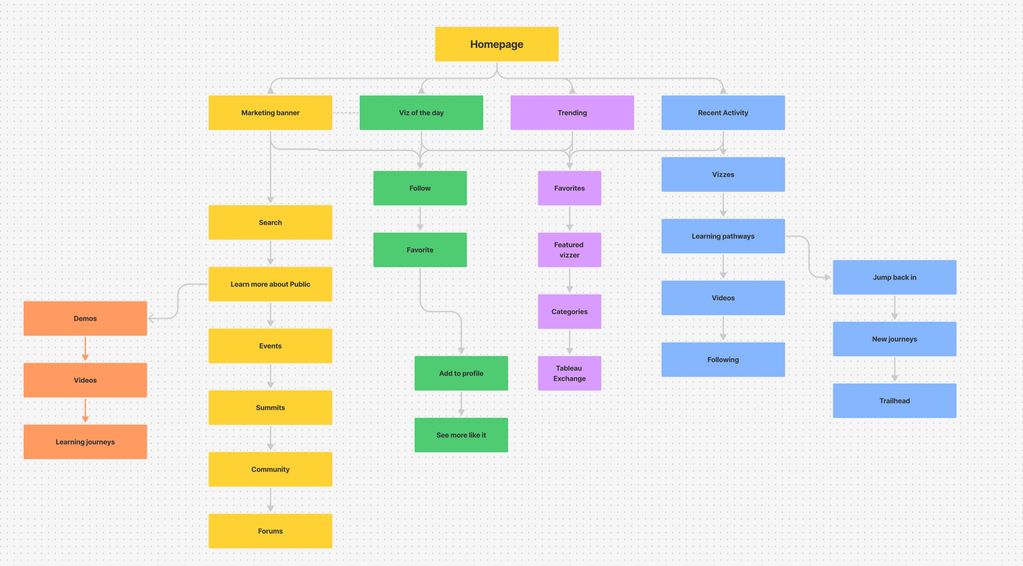 To bring clarity to Tableau Public’s complex ecosystem, I created an information architecture (IA) diagram that mapped how users moved between key surfaces—like the homepage, profile pages, galleries, onboarding, and learning resources. This helped the team visualize overlaps, gaps, and opportunities across the experience.